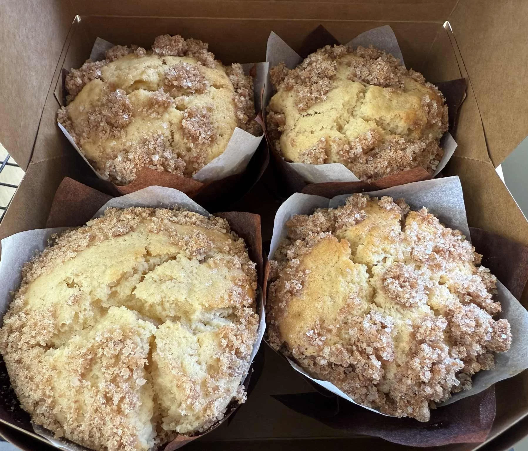 Fluffy, moist muffins made with farm-fresh eggs and baked fresh with organic ingredients. Soft, buttery muffins topped with a golden cinnamon-sugar crumb. Perfect with coffee, tea, or just because.
