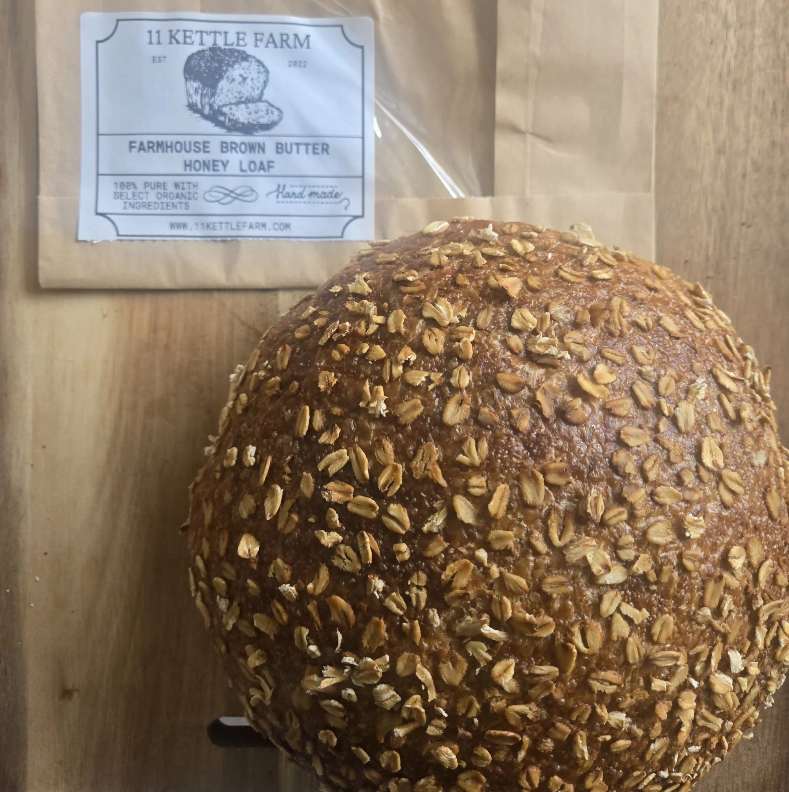 Slow-baked in our farmhouse kitchen, this tender loaf is made with nutty brown butter, pure local honey, and hearty oats for a soft, comforting crumb and golden crust. Every bite carries the warmth of caramelized butter and the gentle sweetness of honey—a true taste of home.